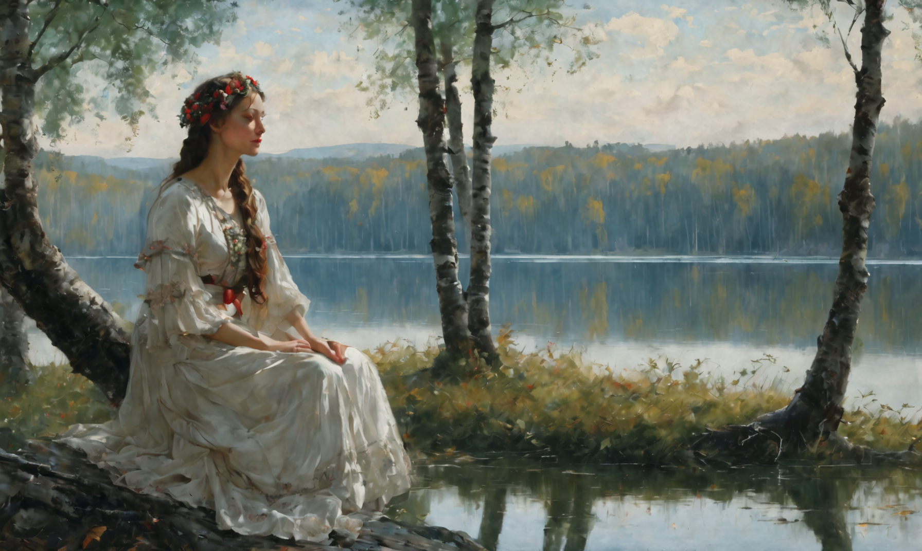 [forest lake painting:beautiful russian girl crying by the lake, [full body view from afar, sitting on the bank, extreme long shot, wide shot, summer:oil painting, impressionism, large strokes, by Mikhail Vrubel, by Viktor Vasnetsov, autumn, kokoshnik headwear, white dress with red ornate frills, embroidery, flower wreath:0.3], single long braid hairstyle, traditional slavic clothes:0.1], serene and melancholic, masterpiece, best quality, birch trees