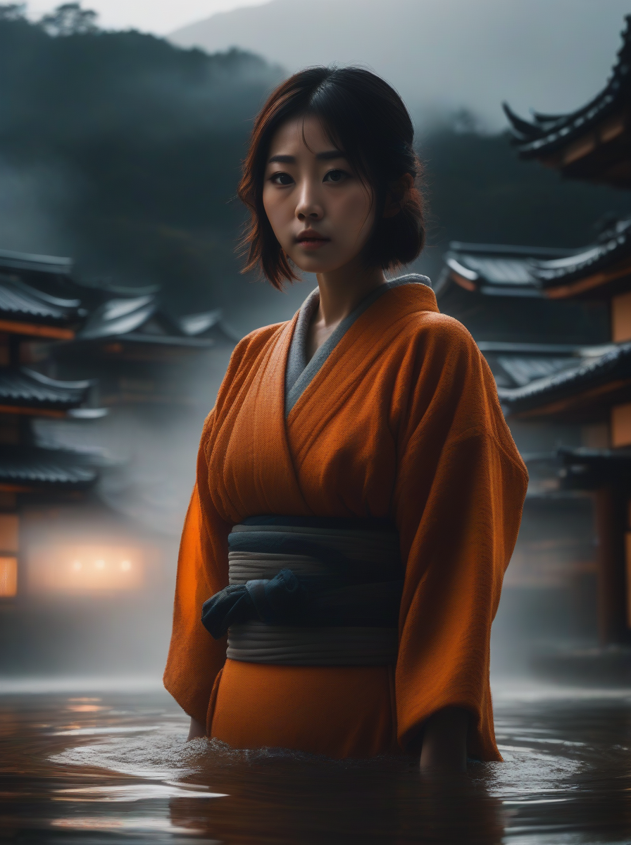 a japanese girl in hotspring,in the style of dark orange and light amber,experimental cinematography,dystopian realism,made of mist,expansive skies,transavanguardia,movie still, detailed eyes, best quality, masterpiece, highres, absurdres, incredibly absurdres, huge filesize, wallpaper, colorful,8K,RAW photo