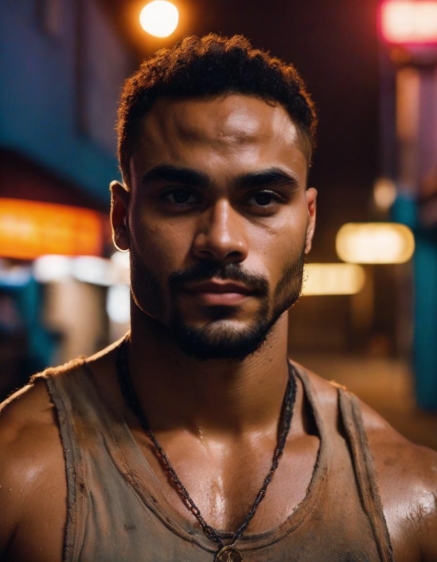 close-up portrait photo sweaty , , , tank top, rugged, thug, hairy, body hair, brutish, , cinematic still, intricate, sharp focus, soft lighting, vibrant colors, masterpiece, , detailed face, , eye iris, intricate details, highly detailed, slate atmosphere, cinematic, dark shot, film grain, lut, spooky, realistic, realistic skin, skin blemishes, skin pores,