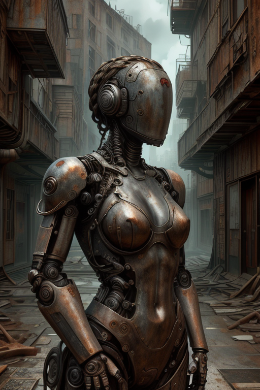 masterpiece,best quality,absurdres,high details,8K,photorealistic,<lora:OxideTech:0.7>,oxidetech,rusty steel,<lora:Concept_-_Hella-sthetic_v2:0.7>,post-apocalypse,ruins,abandoned city background,<lora:Bliznyashki:0.6>,robot,braided hair,jacket,(metal skin:1.3),moscow,