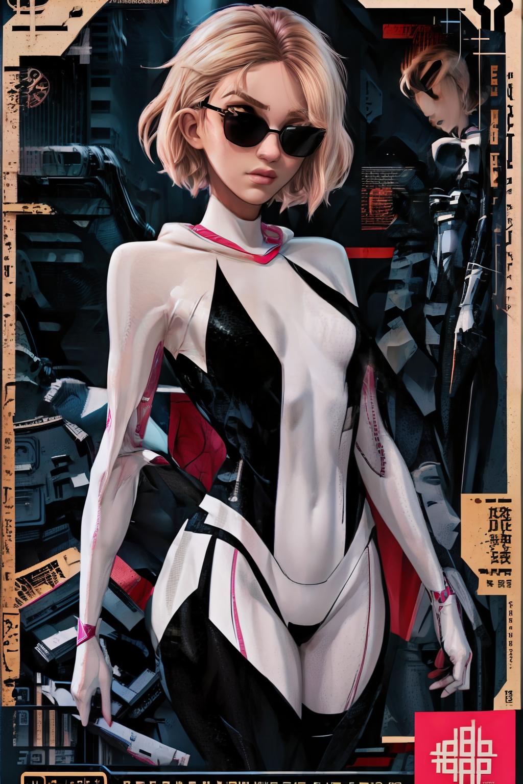 (masterpiece, hyper detailed, best quality:1.2), ((texts, lettering, poster)), bodysuit, gwen stacy , blonde hair , blue eyes, short hair, animification, eyebrow piercing, dynamic pose, dynamic angle, standing, arrogant face, sunglasses, <lora:gwen_1.5:0.75>