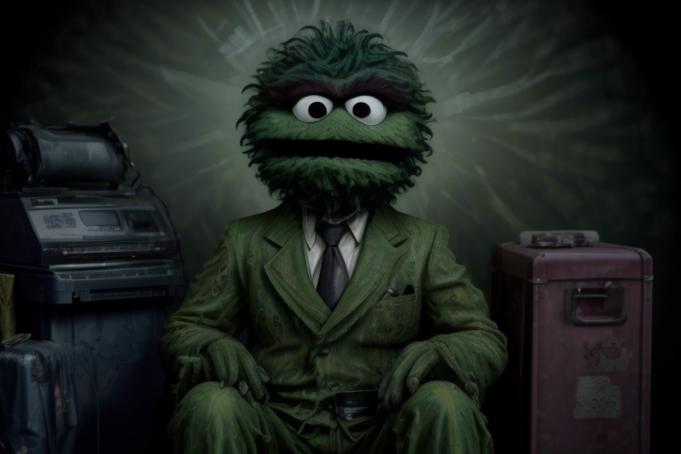 Oscar,our beloved Oscar the Grouch,decked out in an acid-soaked suit,and blazing amidst a psychedelic backdrop of trash heap-turned-las Vegas. The scene crackles with a surrealist vibe as Oscar,with a grimy cigarette dangling from his mouth,clutches a typewriter spitting nonsensical madness and paranoia onto the page. Corruption,drugs,and jaded disillusionment flavor the air as Oscar embarks on his very own gonzo mayhem.,(<lora:oscar-v1:0.9> oscar),<lora:lcm-lora-sdv1-5:1>