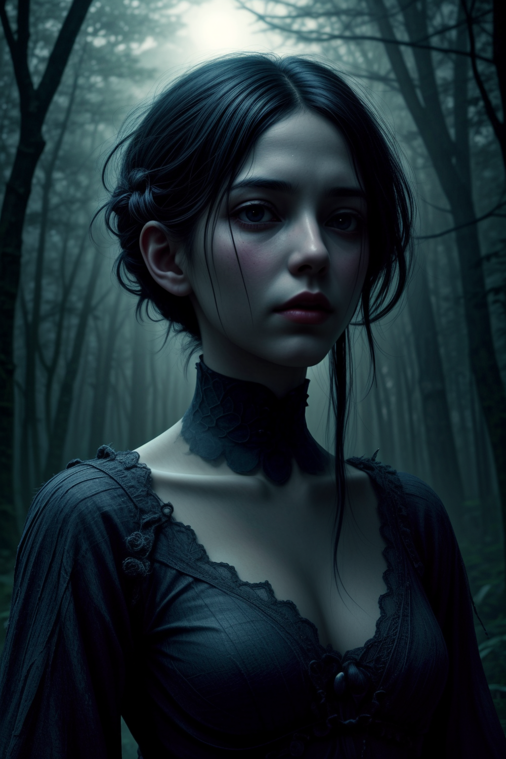 art by Emil Melmoth, Marc simonetti and Makoto Shinkai, landscape of a Tranquil Hideous (woman:1.1) , electric indigo woods, Sun in the sky, Vaporpunk, macabre