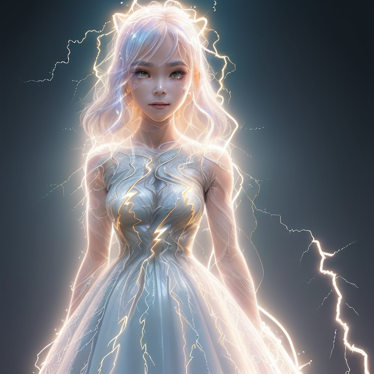 a girl, (wearing a dress, trace the contour with detailed intricate white thin lined crackling shimmering vibrant lightning:1.3), (glowing:1.1), (shimmer and twinkl:1.2), luminism, breathtaking fusion of light, indelible impression, magnificence <lyco:DonMl1ghtning:0.4>