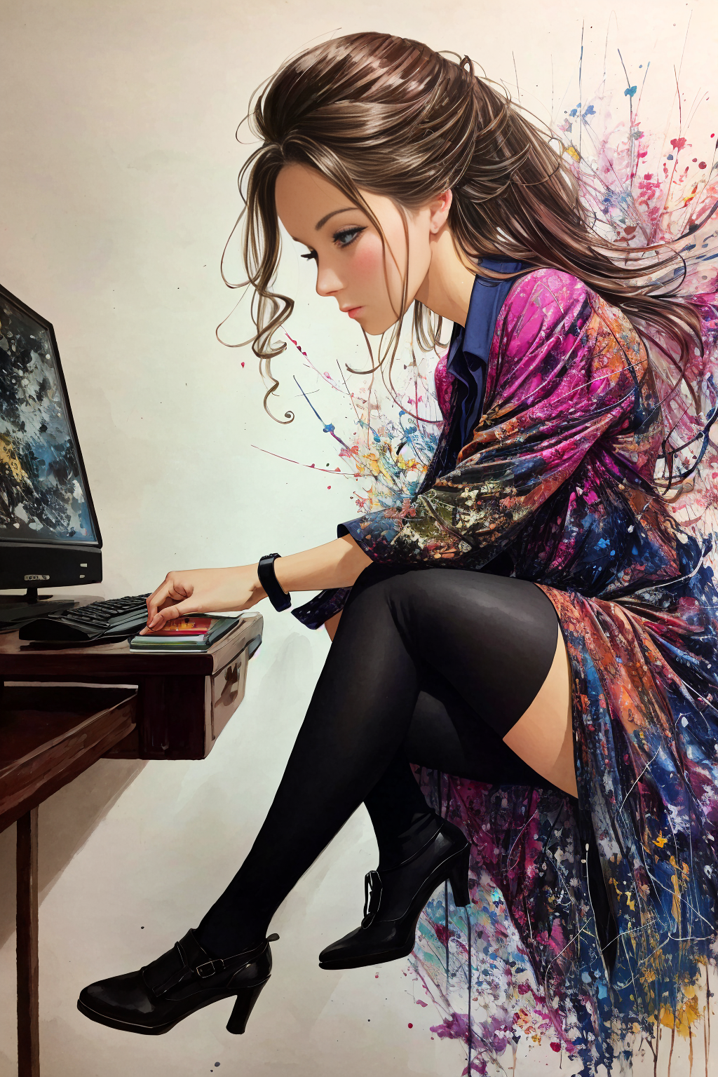 sticker of a full body picture of a beautyfull woman sitting and working on PC, black tights, highly detailed beautyfull face, banksy art, Kim Jung gi, freedom, soul, digital illustration, comic style, steampunk noir, approaching perfection, dynamic, highly detailed, watercolor painting, artstation, concept art, smooth, sharp focus, illustration, art by Carne Griffiths and Wadim Kashin