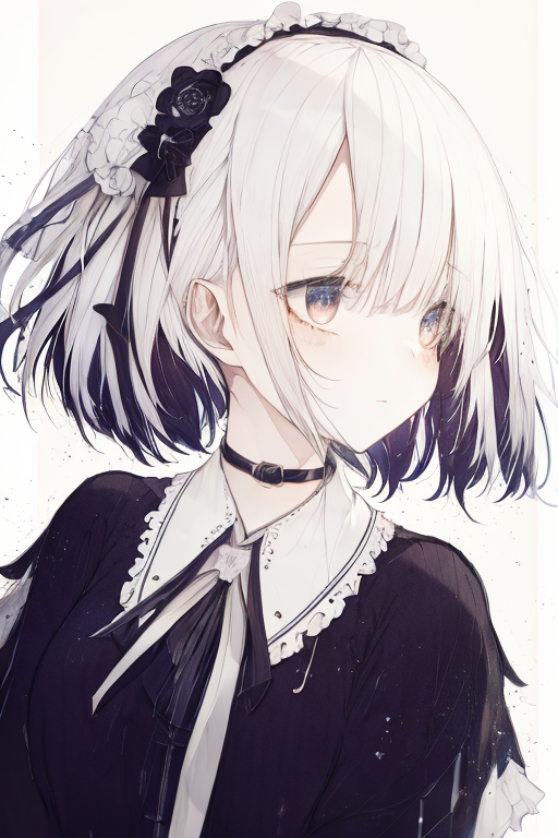 monochrome,anime,1girl,solo,white_hair,black_eyes,portrait,looking away,white background,hair ribbon,<lora:hitoimim-000012:1>