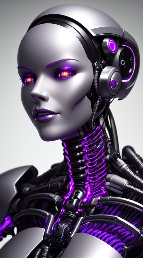 hyperrealistic complex 3d render profile beautiful woman face, close up, 200 mm, (detailed purple eyes), (close mouth), dark hair, shiny silver porcelain, cyborg, robotic parts, biomechanical, biopunk, biopunk, cybernetic, electric wires, (anatomical: 1.2), (elegant), luxorious cyberpunk, vibrant details, cable electric wires, facial muscles, robotic parts, best quality, octane render, studio soft light, rim light, H. R. Giger style, 32k, (best quality)