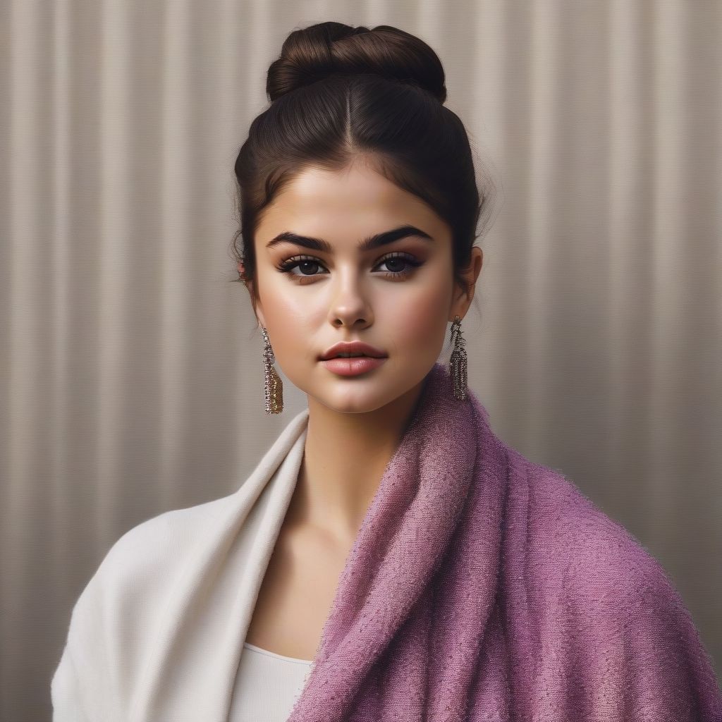 Skeuomorphic portrait of Selena Gomez (ohwx woman) <lora:SelenaGomez-000007:1> standing against a plain textured wall, wearing a thick oversized mohair scarf that has been wrapped around her neck multiple times. She has a perfect smile, colorful makeup, and her hair tied up in a elegant oversized bun.