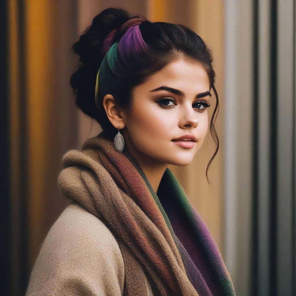 Skeuomorphic portrait of Selena Gomez (ohwx woman) <lora:SelenaGomez-000007:1> standing against a plain textured wall, wearing a thick oversized mohair scarf that has been wrapped around her neck multiple times. She has a perfect smile, colorful makeup, and her hair tied up in a elegant oversized bun.