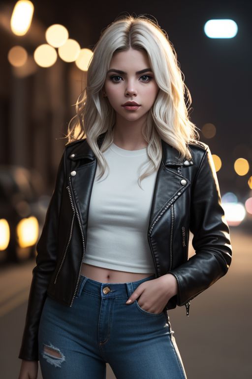 a captivating scene, close up, 27 year old woman, inspired by Law & Order, a sports pub at night, burgundy complimentary color, emphasize her confident stance, black leather jacket and ripped jeans attire, undeniable charisma, highlight resemblance to Ashley Benson, her extremely long wispy platinum-white hair cascades wildly, her allure, appealing essence, sensuality, full swollen lips, striking blue eyes, magnetic charm, enhanced ethereal ambiance, dramatic lighting, cinematic light-dust, stunning bokeh effects, infuse streak lens flares, orange accents, a cinematic touch, ultra-realistic visuals, creamy low contrast, shallow depth of field, ensuring detail shines, classic anamorphic style, 8K RAW format