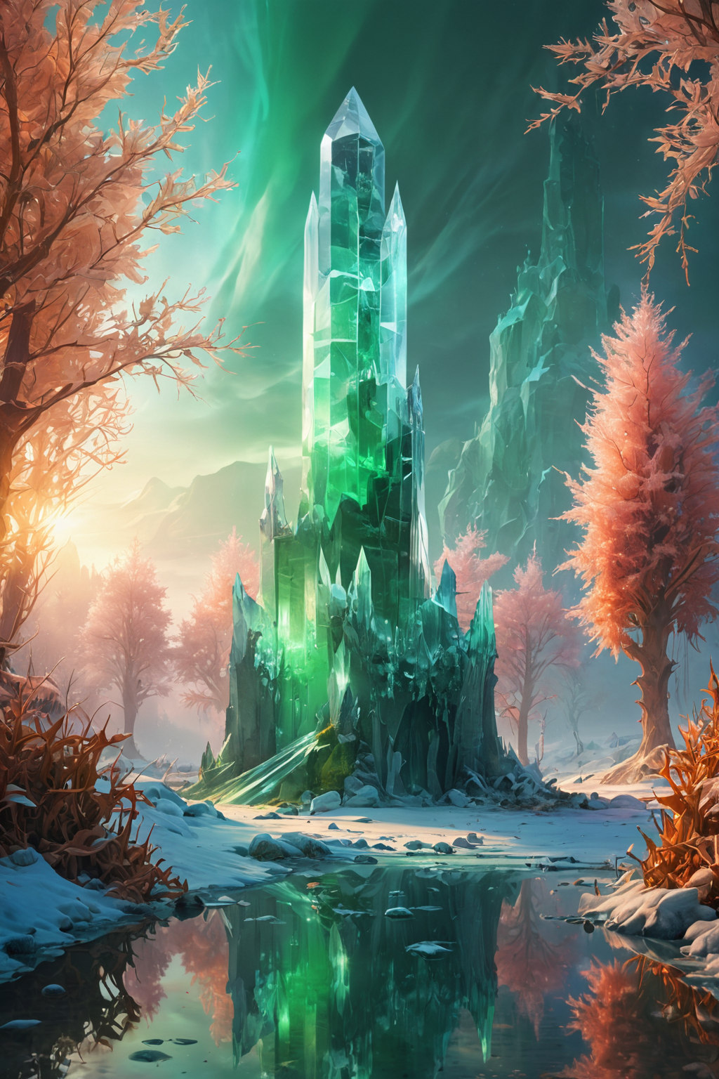 massive crystal tower in a magical landscape surrounded by glowing creatures,ethereal glow,bright colors,winter,(beautiful scene:1.1),green