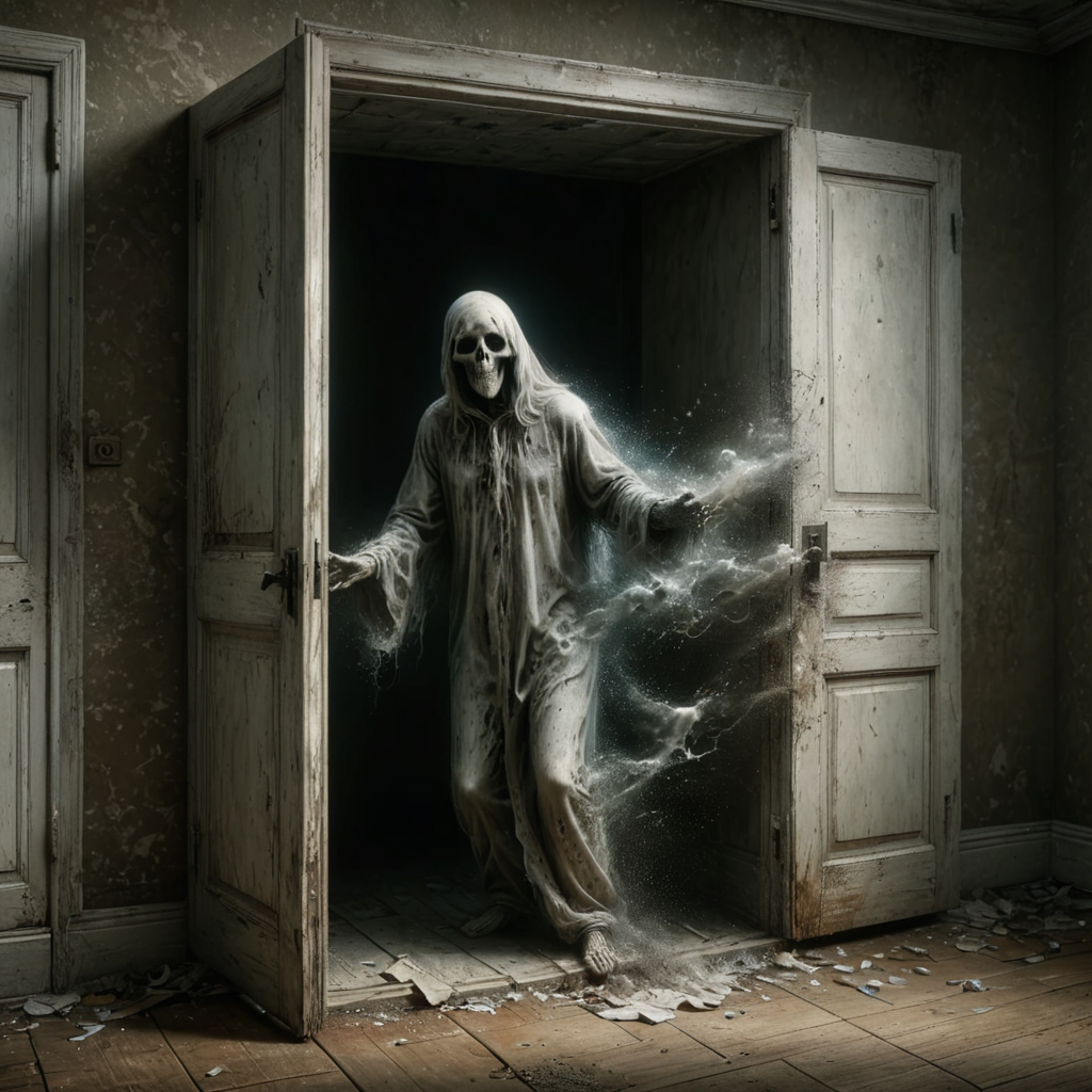 RAW photograph, hyper-detailed, a ghostly figure emerging from the closet. scarry scene, no humans insight, abandoned house. 8k, octane render, hyper-real. <lora:WildcardX-XL-Detail-Enhancer:1> <lora:ral-dissolve:1>