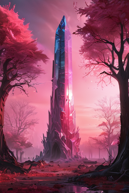 massive crystal tower in a otherworldly landscape surrounded by unearthly trees,ethereal glow,bright colors,dusk,(horror scene:1.1),pink