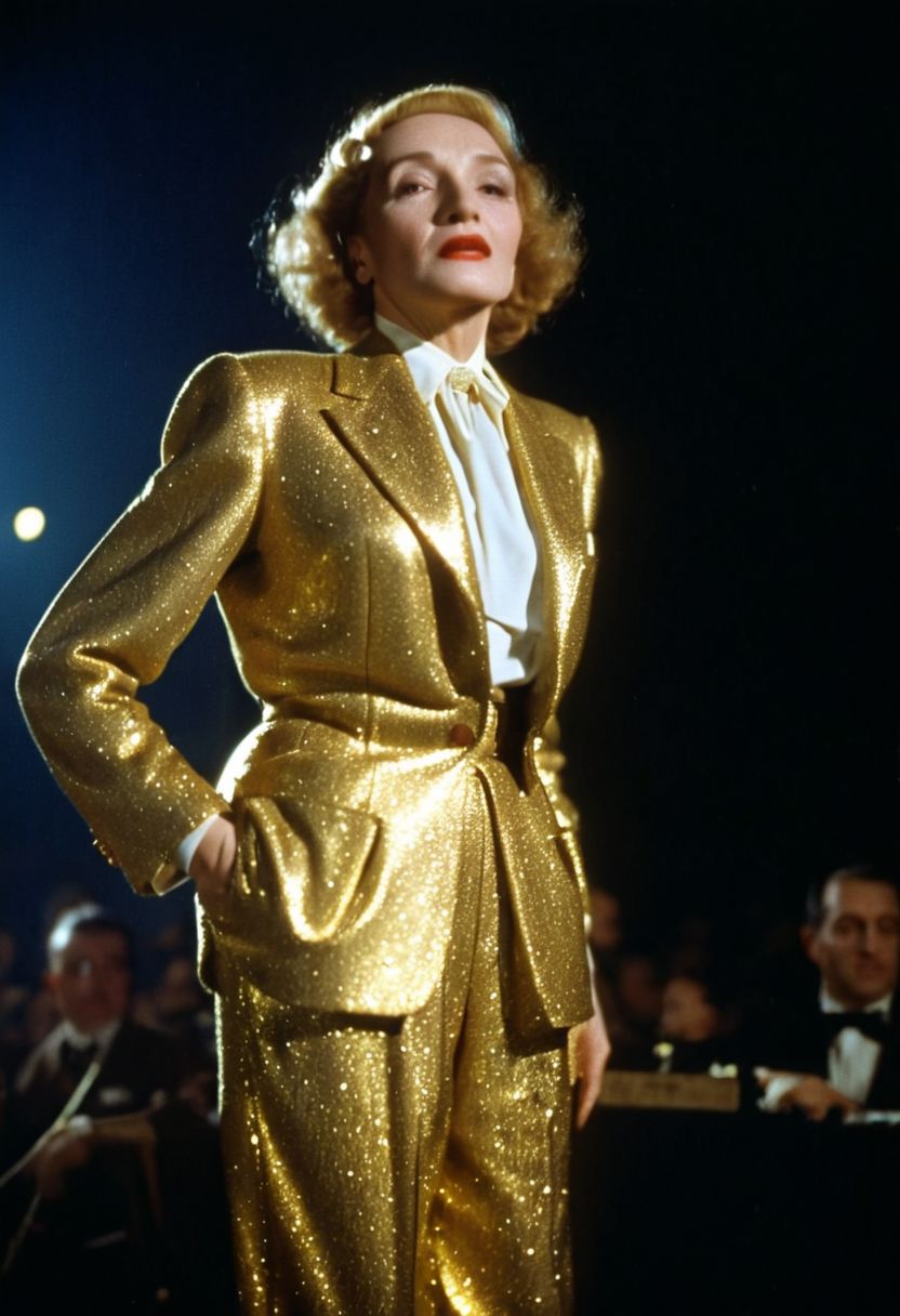 Marlene Dietrich on stage at the Olympia casino in Paris. 1950, Gold trouser suit. Close-up, Stage lighting. cinematic