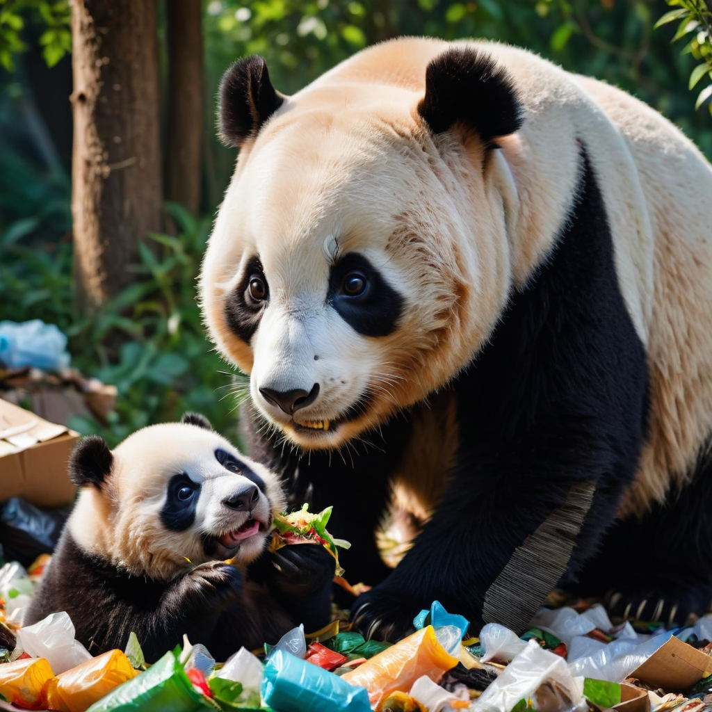 amazing quality,masterpiece,best quality,hyper detailed,ultra detailed,UHD,perfect anatomy,portrait,dof,hyper-realism,majestic,awesome,inspiring,Expressiveh,realistic,beautiful eyes,high quality,4K,absurd resolution,incredibly detailed,masterpiece,sharp,beautiful expressive cute face,extremely detailed,beautiful,no humans,extremely detailed scales,beautiful eyes,sunlight,realistic,high quality,detailed,shadows,glowing,bright colors,high contrast,vivid lighting,cinematic composition,soft shadows,national geographic style,big mother panda with her baby eating garbage,eating garbage,<lora:detailed_notrigger:0.3>,<lora:Cute Animals:0.3>,Cute Animals page,<lora:dvr-trsh:0.8>,dvr-trsh,garbage garden,giant panda and panda,