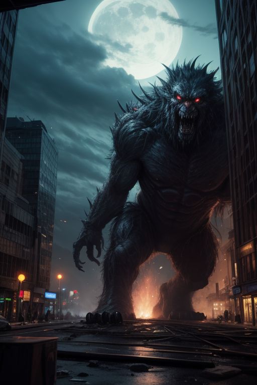 Large imposing monster destroying a city. Nighttime. Cityscape.