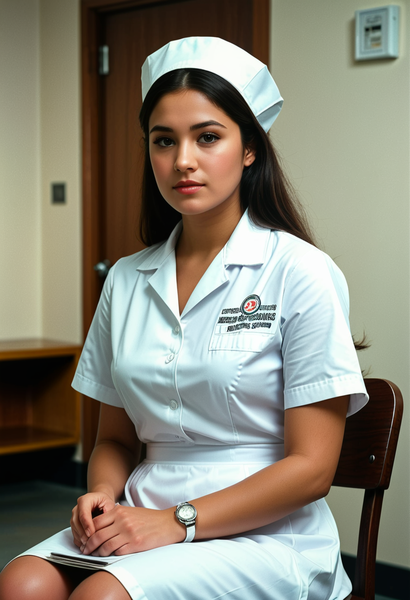 score_9, score_8_up, score_7_up, 1girl (medium full shot) of (bonnie young woman:1.1) nurse mexican with dark hair, brown eyes, medium skin tone, medium build, wearing Classic white nurse uniform with a fitted blouse, pleated skirt, nurse cap, white nursing shoes, sitting with crossed legs, looking over the shoulder, pensive,fig sign, in School infirmary tucked away on the second floor, white walls adorned with educational posters, rows of neatly arranged beds with crisp white sheets, medical cabinets stocked with supplies, soft overhead lighting, comfortable chairs for waiting parents , at night, Masterpiece,best quality, photorealistic, amazing quality, very aesthetic, extremely detailed face,