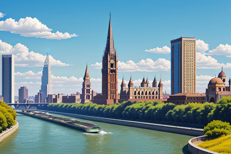Building with towers, sunny day photo, no humans, river, focus on object, 4k uhd, Best quality