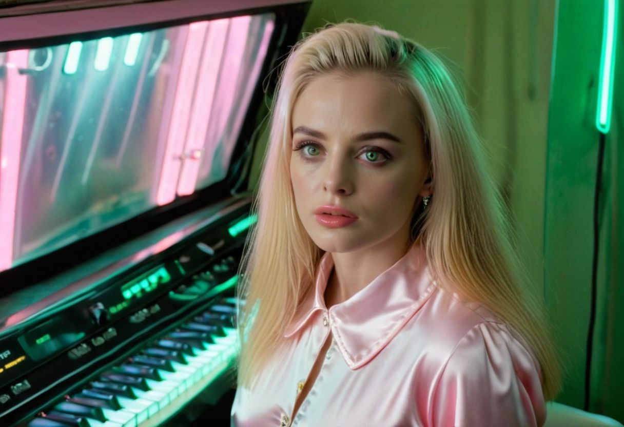 futuristic baroque seafoam-green and pastel-pink soviet-era synthwave oscilliscopes, analog-style monitors with neon lights, green radar sonar displays, a 23-year-old woman looks up from her illuminated keyboard, ultra-realistic vintage photograph, subsurface scattering, (big eyes:2), pale flawless skin, young slim face, long blonde hair, tight latex mini dress, highly reflective, glossy light pink lipstick, light freckles, saturated pink cheeks, very saturated pink blush, heavy blush on nose, thick black eyeliner and black eyeshadow, the woman radiates both sophistication and warmth, a bright golden halo radiates from the woman, glowing blue eyes, visible sweat on the woman's face dripping down, gregory crewdson, peter lindbergh, tim walker, richard avedon, irving penn, alexander mcqueen, steven klein, steven meisel, terry richardson, bright flash, ring light style, highly detailed, high budget, expert lighting, cinemascope, 35mm film, high fashion, hasselblad 120mm medium format boken, award-winning ultra detailed realistic photograph (god rays:3) (phony but extremely beautiful:2)