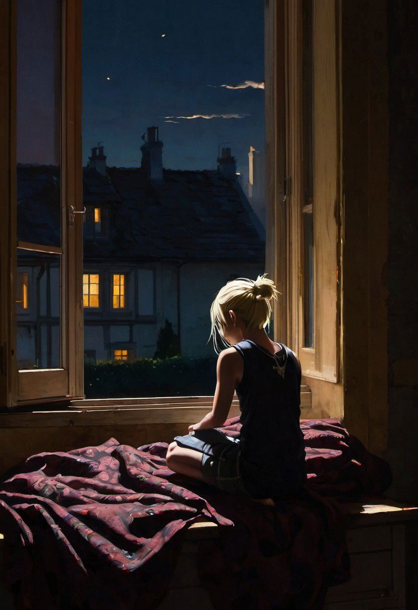 Dark Anime Oil Painting, Rear view of (short) Morino Rinze (girl) kneeling in front of huge wide window of dim dark-maroon upstairs bedroom. Kneeling on large window sill. Head turned to side, (Kitten sleeping on blanket). Nearly-Silhouette. Dim dark-gold spotlight shines at window from outside. Dark (((Night Outside))). (((Mostly Dark Neighbouring house is very close))). Short wavy French-braid vanilla-blonde Emo-cut hair with undercut. Tanned Skin. Spine. Shoulders. Shoulderblades, (athletic buttocks), Flex, Pointed small chest sideboob. Coffee. British suburbia, (((logical lighting))), ((logical shadows)),