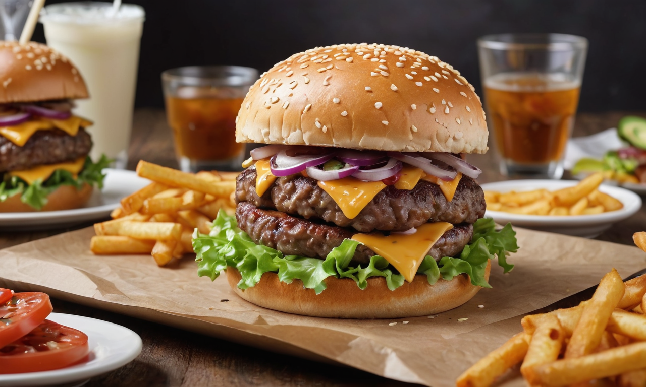 HDR photo of "Capture the mouthwatering appeal of a gourmet burger in a tantalizing advertisement photo that leaves viewers craving a delicious bite . High dynamic range, vivid, rich details, clear shadows and highlights, realistic, intense, enhanced contrast, highly detailed, Envision the burger positioned front and center, its perfectly grilled patty nestled between two golden-brown buns and stacked high with fresh, colorful toppings. Each ingredient is meticulously arranged to showcase its freshness and quality, from crisp lettuce and juicy tomato slices to creamy avocado and tangy pickles, Zoom in on the details of the burgerâthe glistening sesame seeds on the bun, the melted cheese cascading down the sides of the patty, and the savory aroma that wafts up from the perfectly cooked meat. Every element of the burger is expertly crafted to tantalize the senses and ignite the appetite, Meanwhile, the background sets the scene for the ultimate dining experience, whether it's a cozy diner with checkered tablecloths and retro décor, a trendy bistro with exposed brick walls and industrial chic furnishings, or a bustling food truck with colorful signage and a lively atmosphere. Soft lighting and subtle shadows add depth and dimension to the photo, creating a sense of warmth and intimacy that draws viewers in, In the foreground, a pair of hands reach out to pick up the burger, ready to take that first delicious bite. The anticipation is palpable as the viewer imagines sinking their teeth into the juicy patty and savoring the explosion of flavors with every mouthful, This mouthwatering portrayal invites viewers to indulge in the irresistible temptation of a gourmet burger, showcasing its irresistible appeal and inviting them to satisfy their cravings with the ultimate comfort food experience. It's a photo that celebrates the simple pleasure of a well-crafted burger and captures the essence of good food shared with good company."