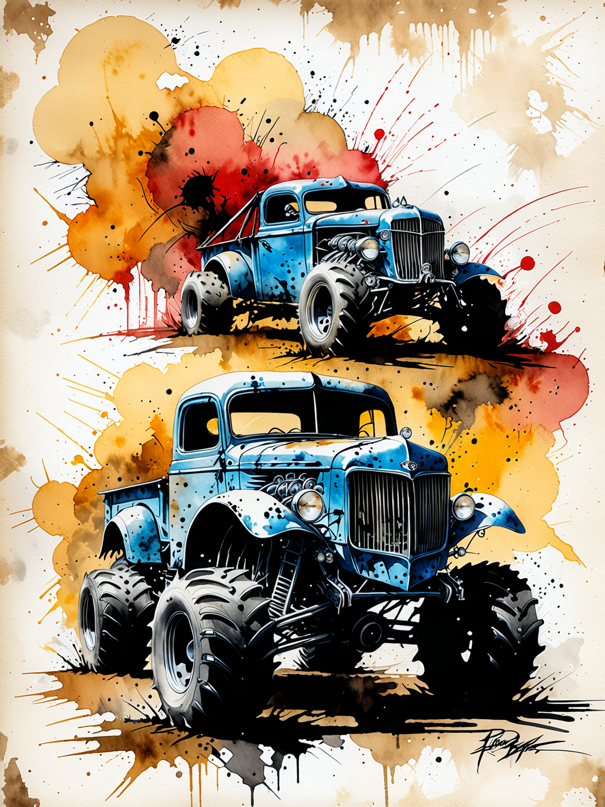 watercolor illustration of p3tr4_morg4n, (art by luis royo) , ((Hot-Rod pick-up monster-truck)), old style ink illustration, on parchment, ink splashes, ink stains, ink smears, faded ink,