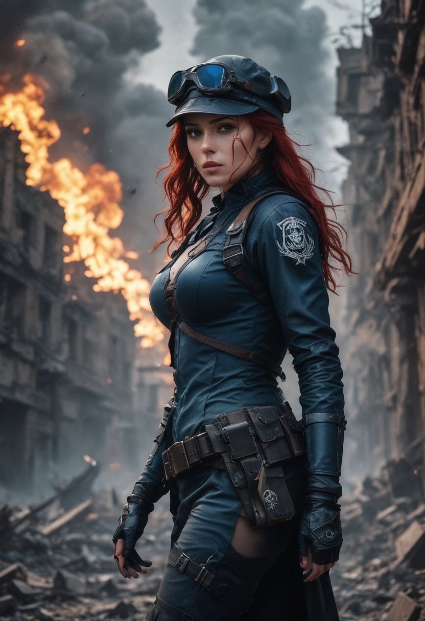 Ultra-realistic beautiful Post-Apocalyptic Warrior girl, wavy red hair, Intricately Designed tight combat uniform, perfect athletic figure, beautiful perfect detailed pupils, wet oily shiny skin, beautiful firm Breasts, defiant and seductive, thermo-nuclear war, Ultra-realistic of sinister Nuclear war, Mushroom cloud in the background from a ground based nuclear explosion, a fiery pressure wave devastates buildings and there are pieces of ruins everywhere, The nuclear Apocalypse cinematic, Sinisterly detailed, Perfect, high detail, fire and dark color scheme with deep saturation, artstation, cinematic lighting, Photograph Taken on Nikon D750, Intricate, Digital Illustration, Scenic, HyperRealistic, HyperDetailed, Unreal Engine, CryEngine, Octane render, extremely high resolution 8K, Greg Rutkowski, deep color, Cinematic Lighting, intricate, smooth, sharp focus, digital painting, blue and red as complementary colours, Apocalyptic war, light and shadow, three-dimensional lighting, combination of various colors and shades, Digital Illustration, Intricately Designed buildings city, Intricate, Intricate cinematic lighting, Digital Illustration