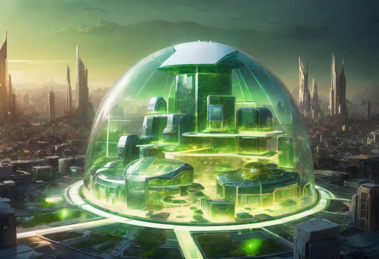 a futuristic city with white and yellow-green buildings and glowing rocks on the ground surrounded and enclosed by a large, glowing fragile glass dome.