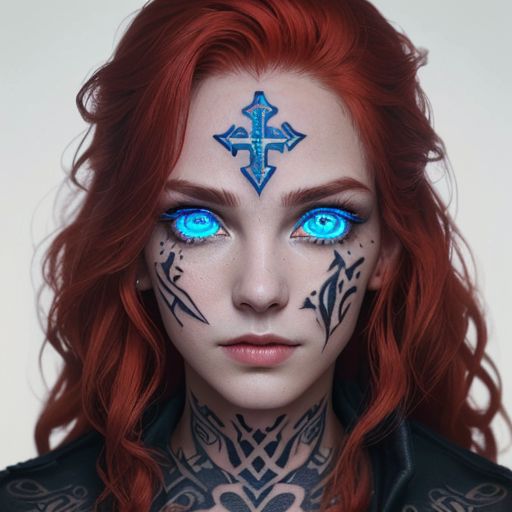 bright red hair, human female, (feminine:1.7), (beautiful face, detailed face:1.6), (beautiful eyes, detailed eyes:1.7), (looking at viewer, eye contact, intense:1.6), (long hair, red hair, curly hair:1.3), , ((masterpiece, best quality, high resolution, realistic, best quality,)), photo realistic, Perfect Face, (detailed face). <lora:GoodHands-vanilla:0.6> <lora:add-detail-xl:0.8>, mage, military uniform coat, dagger, rune dagger, glowing runes, , (((glowing magic symbols tattoos, religious tattoos))), ((face tattoos)), glowing tattoos, stone tower in the background