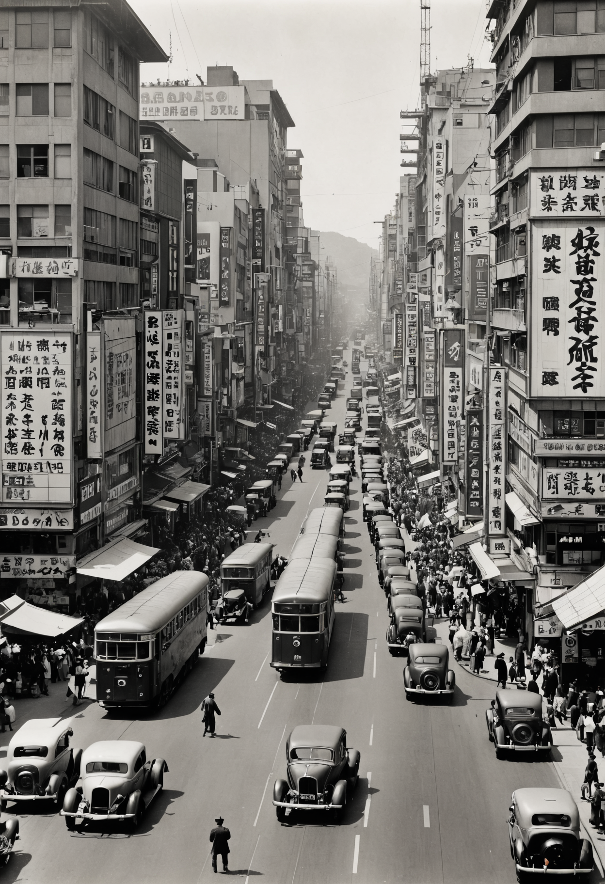 photo of a Main Street of Akihabara in 1930s, (large flashy billboards), countless passersby, many cars, (station viaduct), clear sky, noon, (best quality:1.3), photo-realistic, highly detailed, high resolution RAW photo, film grain <lora:add-detail-xl:0.6> <lora:offset_0.2:0.7>