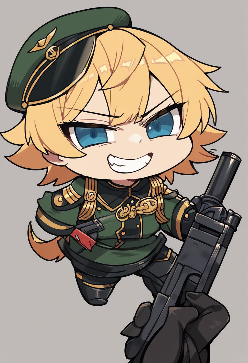 score_9, score_8_up, score_7_up, score_6_up, score_5_up, score_4_up, rating_safe,source_anime,godoacrime, 1girl, chibi, pov,hand, holding gun,tanya degurechaff,youjo senki,blonde hair,blue eyes,military cap,military uniform,evil grin