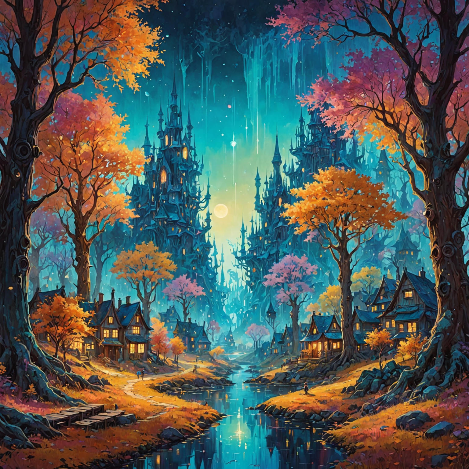 a town in a (otherworldly forest:1.1),ethereal glow,bright colors,autumn,fantastical landscape full of bioluminescent trees,(serene scene:1.1)
