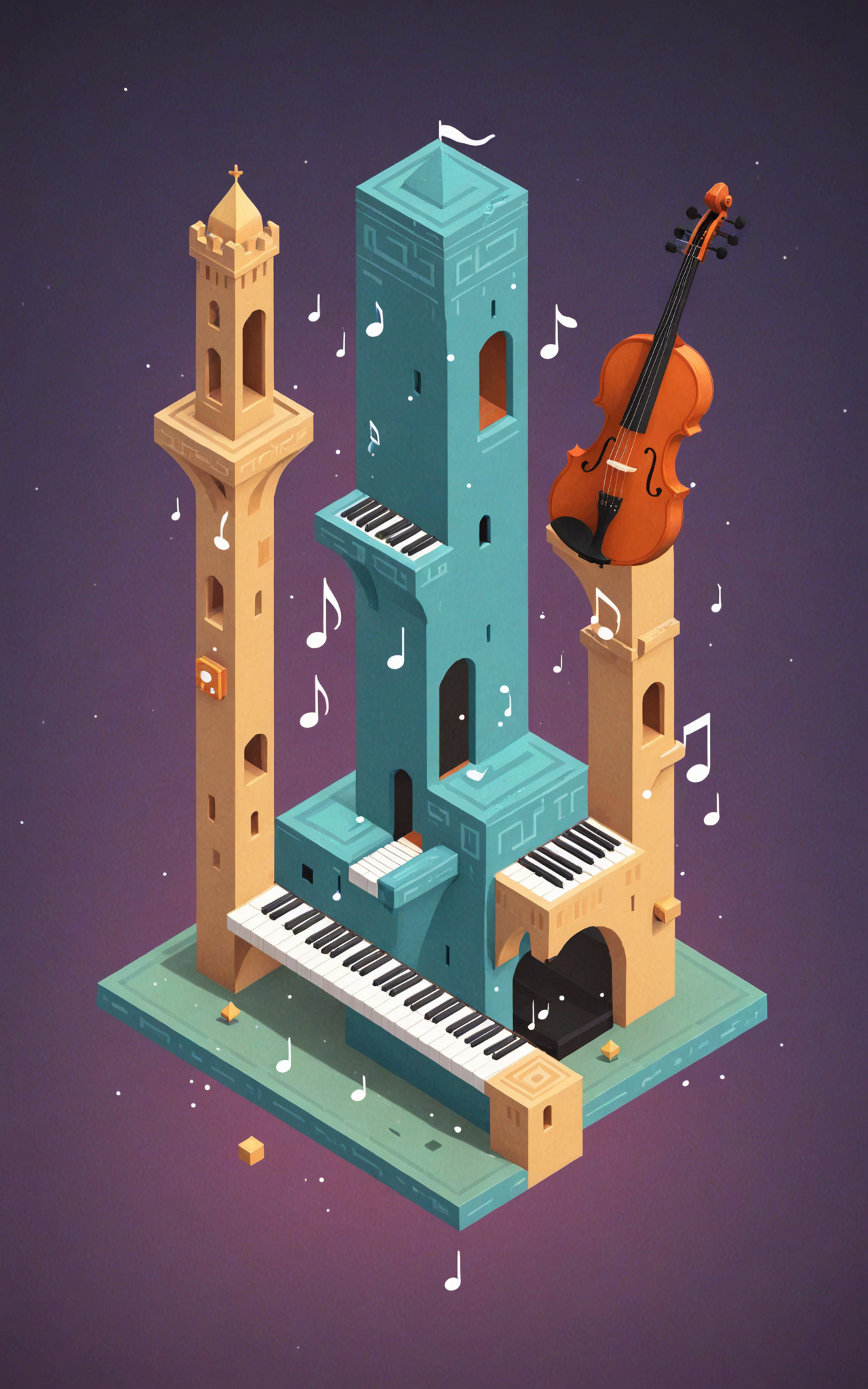 video game Monument Valley style, < <lora:Monument Valley style:0.7> musical_note, piano_keys, violin,