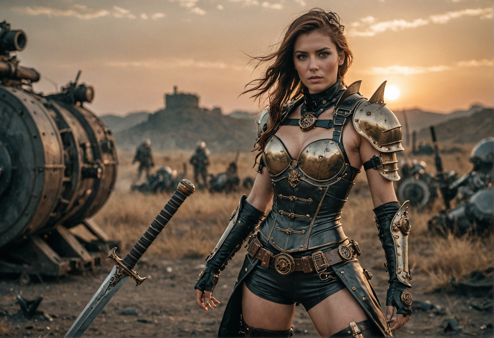 RAW professional photo, NSFW steampunk female warrior, battle-worn high tech armor, showing skin, glowing sword, dramatic battlefield, dusk, fierce determination, shot on a ARRI ALEXA 65 camera, 75mm lens, 8K resolution <lora:add-detail-xl:1>