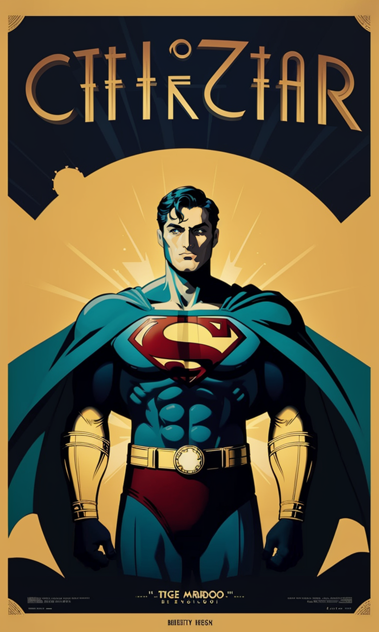 BioshockARTDECO, poster, 1930s \(style\), simplistic, art deco, superman, vibrant color, intricate, 8k, uhd, best quality, negative space, high quality illustration, 1 man, cape,, cinematic lighting