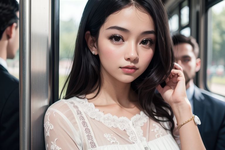 1girl, looking outside, in train, modern, relaxing, intricate details, black hair, ((beautiful face)), (((best quality, masterpiece))),(((realistic))),