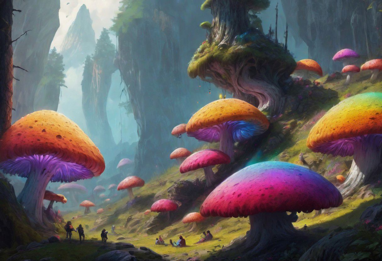 a realistic small rainbow fungal forest formed between conjoined mountains with several people relaxing and sleeping on top of the mushrooms.