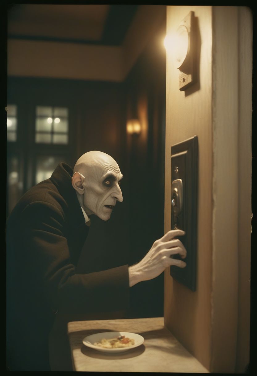 highly detailed and hyper realistic dynamic 35mm photo of ((Nosferatu)), touching (light switch), fast hands, shot on polaroid film, cinematic still frame, film grain, shallow depth of field, creepy, crouched, faded colors, vintage, motion blur, high contrast, deep shadows, highly detailed and hyper realistic, ((((lightning eyes)))), seafood restaurant interior
