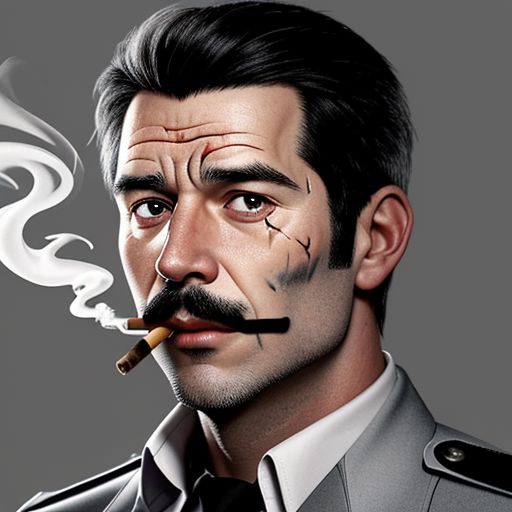 Adult male, age 45+, severe facial expression, soldier, scar across the eye, no left eye, scar from left temple to right chin, square chin, facial stubble, no mustache, sideburns, manly face, dark hair with gray, cigarette in mouth.