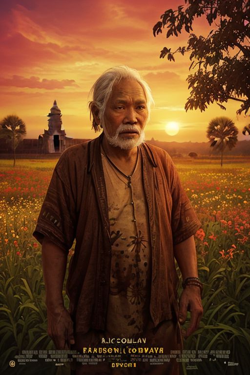 Movie Poster Design: Weathered old man with a treasure map tattoo stands amidst vibrant wildflowers, gazing at a breathtaking Cambodian sunset (realistic, emotive portrait, indigenous culture, American tonalist, warm earth tones & sunset hues).