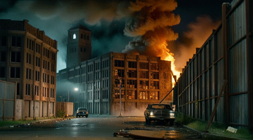 cinematic movie still of a city at night in the apocalypse, (TWDAlexandriaWall:2) divides the streets, rusted metal, blackout, angled supports, abandoned office buildings tower overhead at night, mushroom cloud, fires burn inside, dirty street, billowing smoke, dense fog, shallow depth of field, f1.4, film look, gamma 2.4 <lora:TWDAlexandriaWall:1>