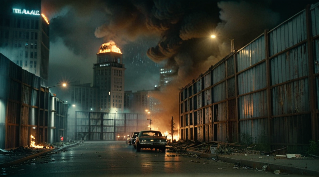 cinematic movie still of a city at night in the apocalypse, (TWDAlexandriaWall:2) divides the streets, rusted metal, blackout, angled supports, abandoned office buildings tower overhead at night, mushroom cloud, fires burn inside, dirty street, billowing smoke, dense fog, shallow depth of field, f1.4, film look, gamma 2.4 <lora:TWDAlexandriaWall:1>
