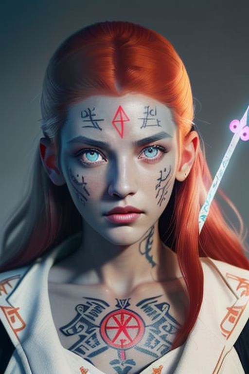human female, (feminine:1.7), (beautiful face, detailed face:1.6), (beautiful Grey eyes, detailed eyes:1.7), (looking at viewer, eye contact, intense:1.6), (long hair, red hair, curly hair:1.3), , ((masterpiece, best quality, high resolution, realistic, best quality,)), photo realistic, Perfect Face, (detailed face). <lora:GoodHands-vanilla:0.6> <lora:add-detail-xl:0.8>, mage, white military uniform coat, dagger, rune dagger, glowing runes, , (((glowing magic symbols tattoos))), ((face tattoos)), glowing tattoos, stone tower in the background