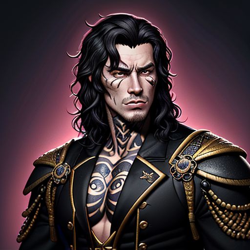 a young man, he has short dark wavy hair. he has a sharp jawline, he has mystical tattoos, he wears dark, tailored clothing that is fancy and elegant with a hint of rebellion, he has a few scars and is regal and rugged. young and handsome. looks fancy and sophisticated.
