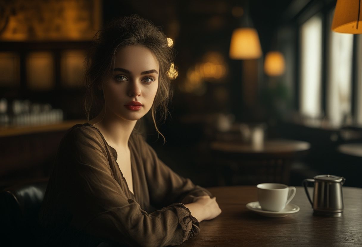 realistic photo, raw image, ultra resolution, Hasselblad, 85mm f/5.6, best quality, ((masterpiece)), (maximum details), 1 woman, 25 years, beautiful detailed eyes, smokey eye makeup, beautiful lips, medium-sized lips, beautiful hair, at round tables in cafe, dim volumetric lighting, cinematic lighting, light from small lamps, an atmosphere of comfort and serenity