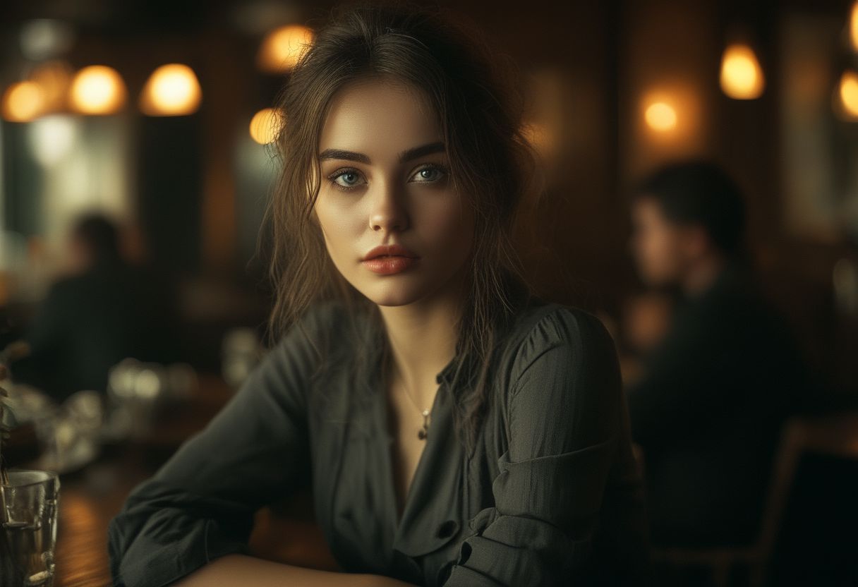 realistic photo, raw image, ultra resolution, Hasselblad, 85mm f/4, best quality, ((masterpiece)), (maximum details), 1 woman, beautiful detailed eyes, smokey eye makeup, beautiful lips, beautiful hair, at round tables in cafe, dim volumetric lighting, cinematic lighting, light from small lamps, an atmosphere of comfort and serenity