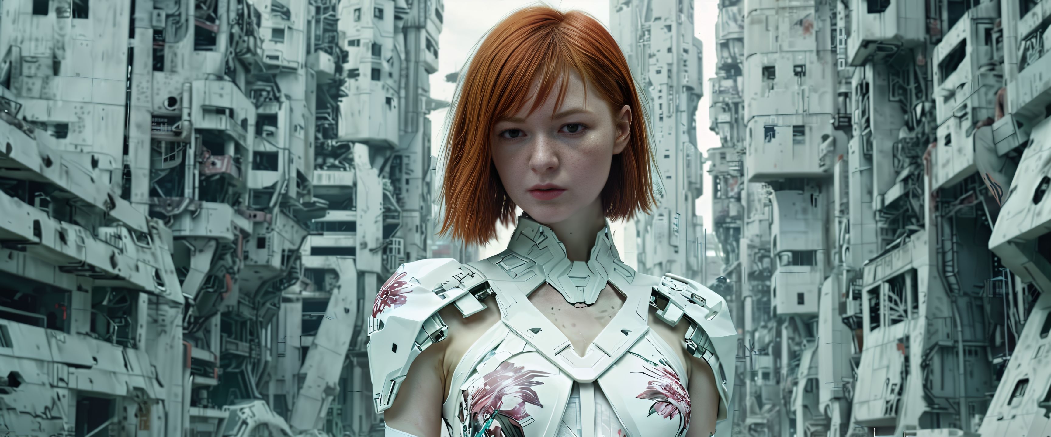 Portrait of young redhead female in desolate futuristic city, wearing short white dress with floral print, style of Ruan Jia