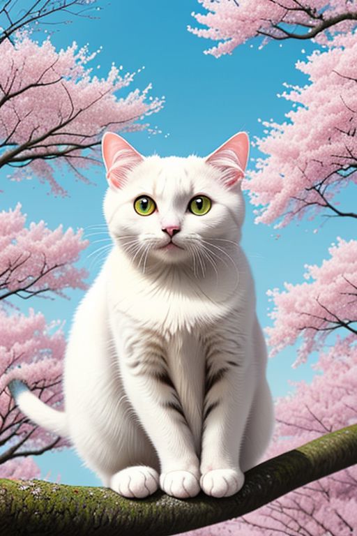 masterpiece, best quality, no humans, cat, animal focus, outdoors, sky, day, branch, tree, animal, cherry blossoms, flower, white cat, cute, (fluffy), big eyes, soft