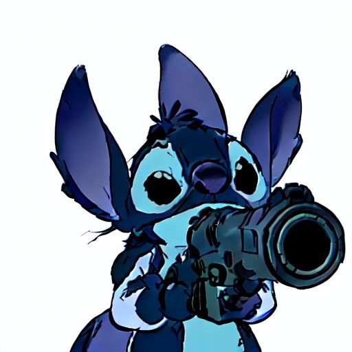 cartoon design of STITCH SHOOTING BLASTERS <lora:xl_more_art-full_v1:0.5> dual wielding guns, ((Type-33 needler)), big ears, white back ground