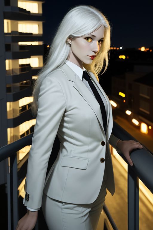 1 girl, in a formal suit, pale skin, yellow eyes, white hair, long hair, lights in the background, view from the balcony, night